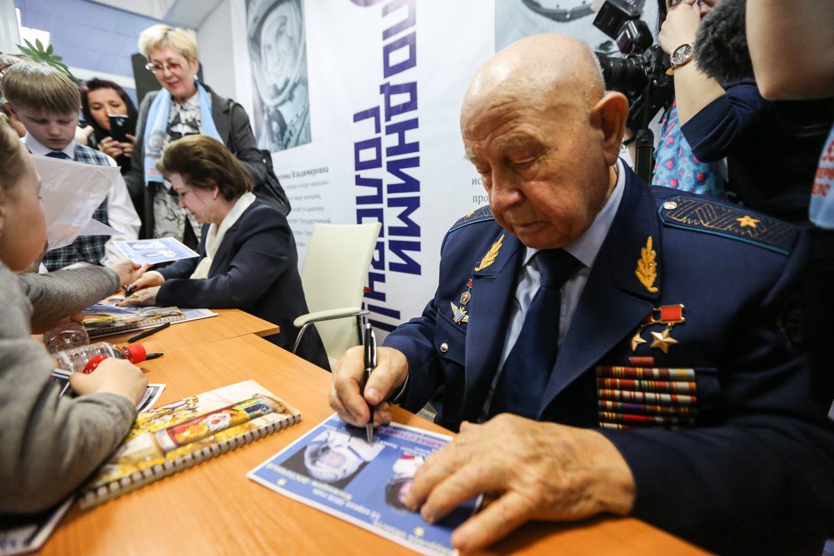 Русские чествуют в городе Циолковском легендарных космонавтов В. Терешкову (первая женщина-космонавт) и А. Леонова (первый в открытом космосе).